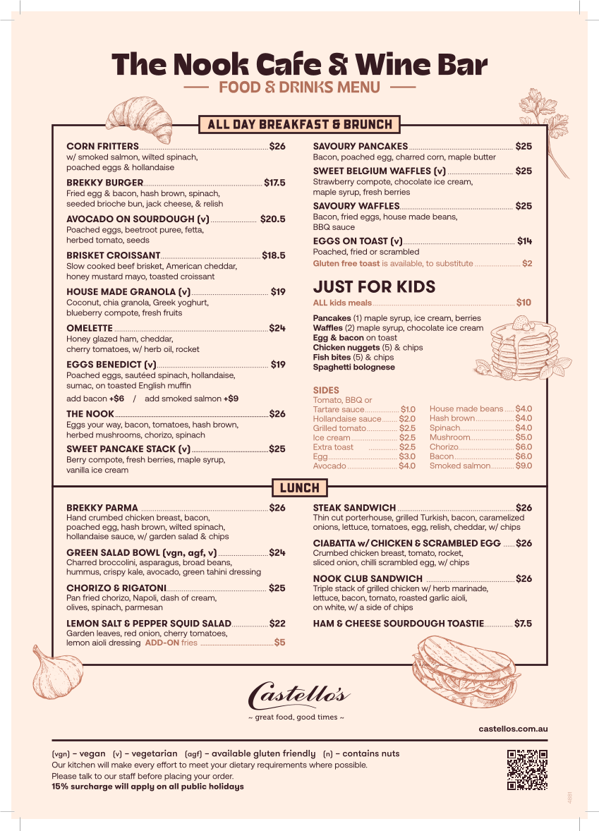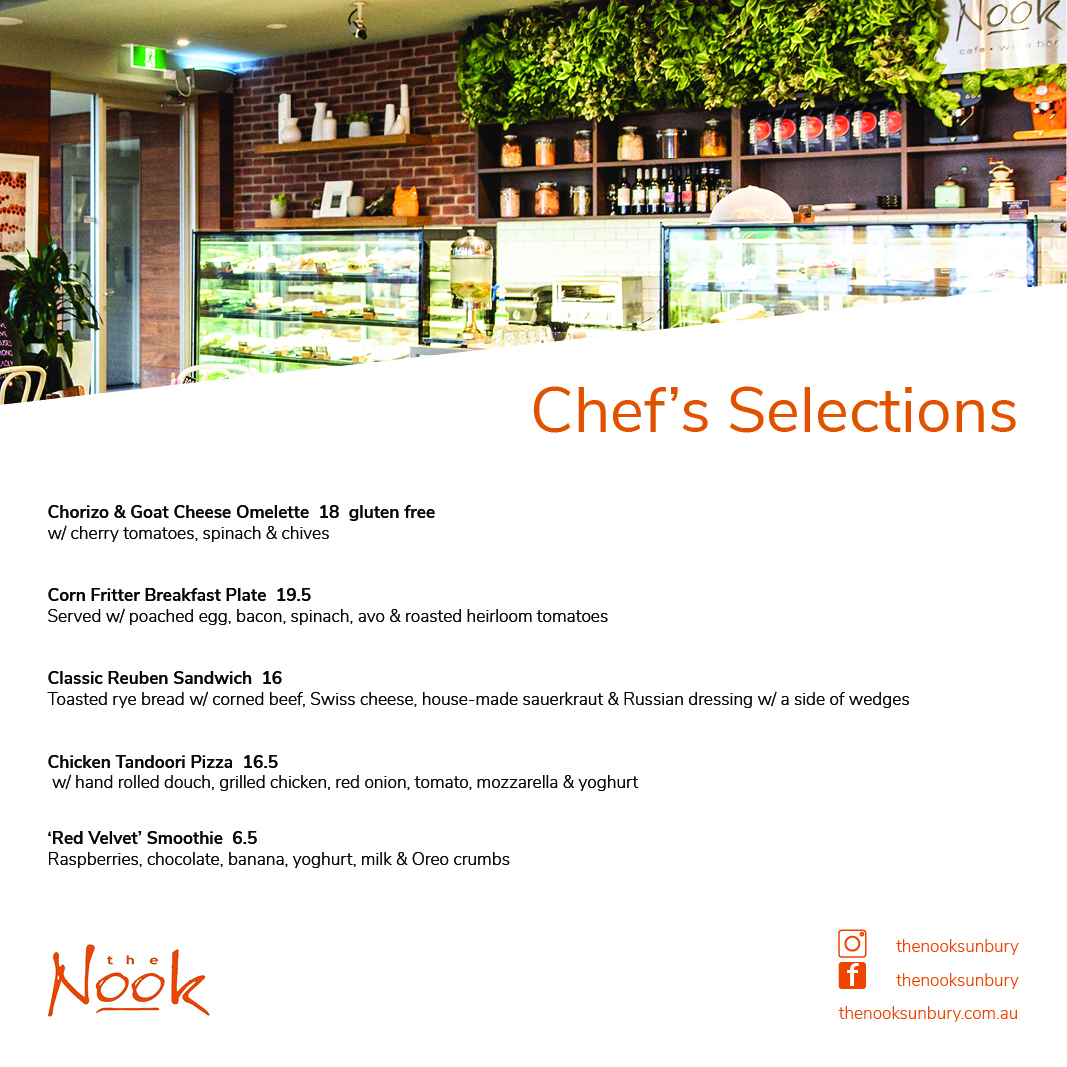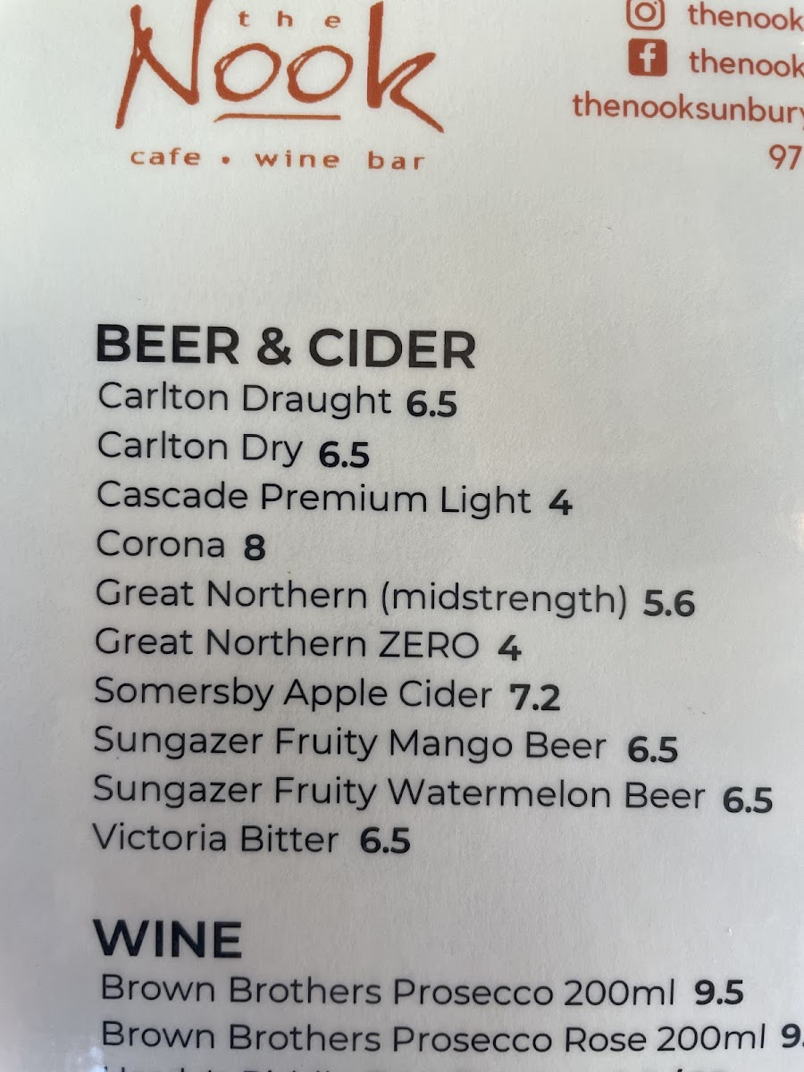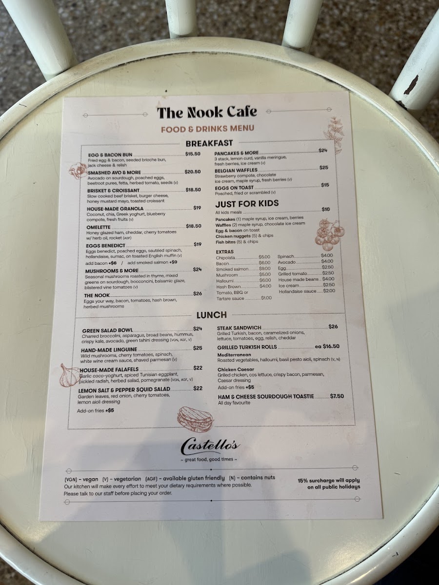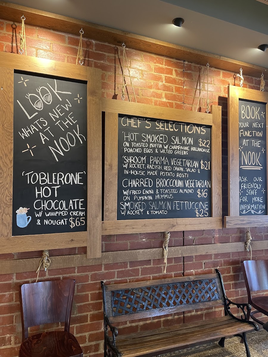 The menu at The Nook Cafe in Sunbury offers a delightful selection for all tastes. For those craving a hearty start to the day, the Corn Fritters, Brekkie Burger, and Avocado on Sourdough are popular choices, alongside the indulgent Brisket Croissant and the light yet satisfying House Made Granola. For the little ones, the cafe provides a range of kid-friendly meals, ensuring a treat for the whole family. At lunch, the Brekkie Parma delivers a twist on a classic, while the Green Salad Bowl provides a refreshing and healthy option. The Chorizo & Rigatoni and Lemon Salt & Pepper Squid Salad cater to those with a more adventurous palate, while the Steak Sandwich remains a staple for those who enjoy a filling and delicious meal. Overall, The Nook Cafe’s menu strikes a perfect balance between comfort and creativity, with offerings that are sure to please both casual diners and those seeking something a bit more refined.